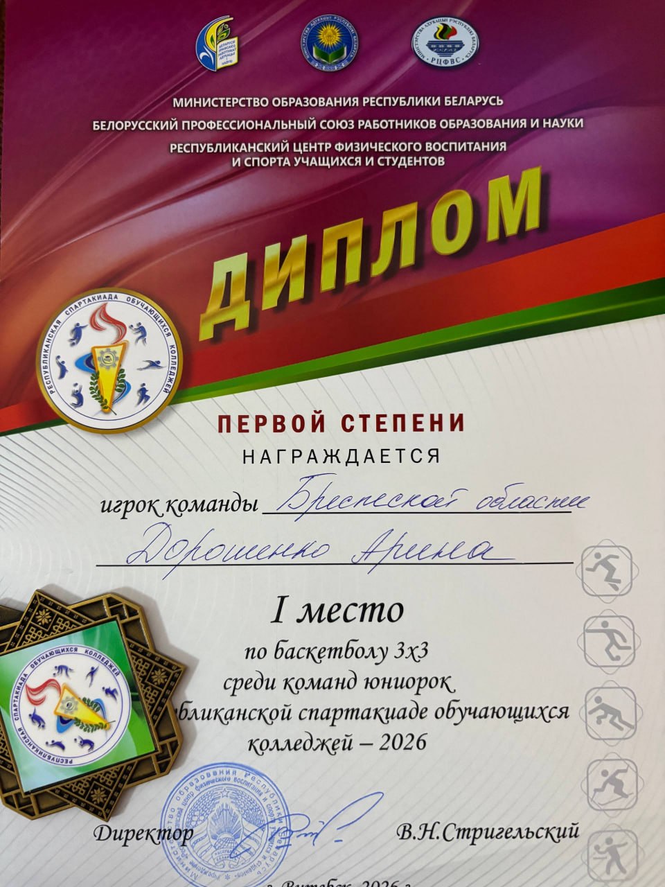 В рамках Республиканской спартакиады обучающихся колледжей – 2026 успешно завершились финальные соревнования по баскетболу 3х3 среди юниорских команд. Сборная Брестской области продемонстрировала высокий уровень мастерства, исключительную волю к победе и превосходную командную сыгранность, одержав уверенную победу и заняв первое место. Особо отмечается участие в турнире нашей учащейся Дорошенко Арины Сергеевны, которая была удостоена звания самого ценного игрока (MVP). Данное признание является результатом ее выдающихся индивидуальных качеств, целеустремленности и спортивного характера. Достигнутый успех является закономерным следствием напряженной работы всей команды, взаимной поддержки спортсменок и профессионального подхода тренерского штаба. Приносим искренние поздравления победительницам, их наставникам и всем, кто оказывал поддержку команде на пути к достижению поставленной цели. Желаем дальнейших успехов и покорения новых спортивных вершин.