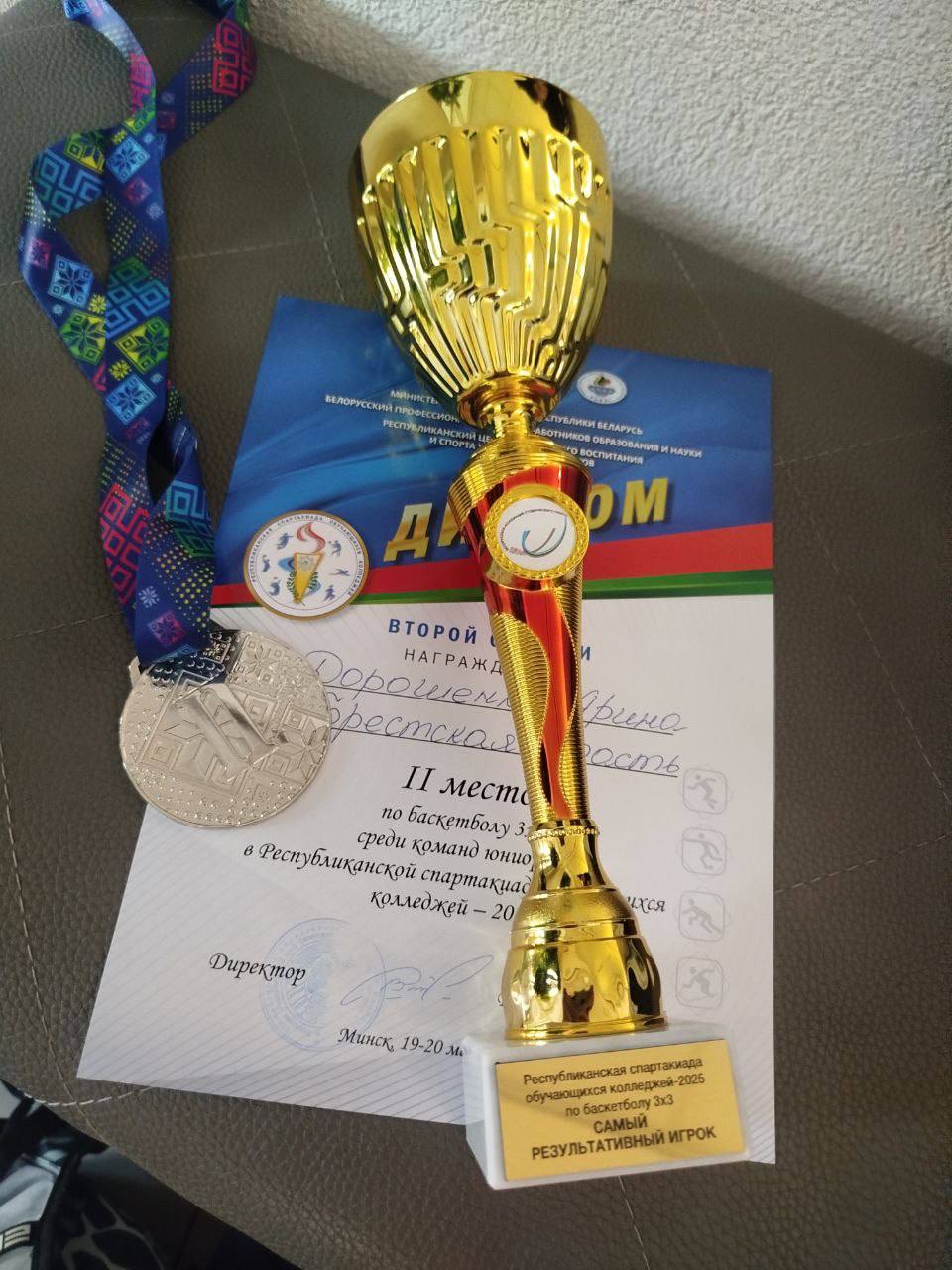 Учащаяся группы Т291-23 Дорошенко Арина в составе команды сборной Брестской области стала призером финальных соревнований по баскетболу 3х3 среди юниорок в рамках Республиканской спартакиады обучающихся колледжей -2025 . Спартакиада проходила с 19 по 20 мая 2025 года в городе Минске на спортивной базе баскетбольного клуба «Минск».
