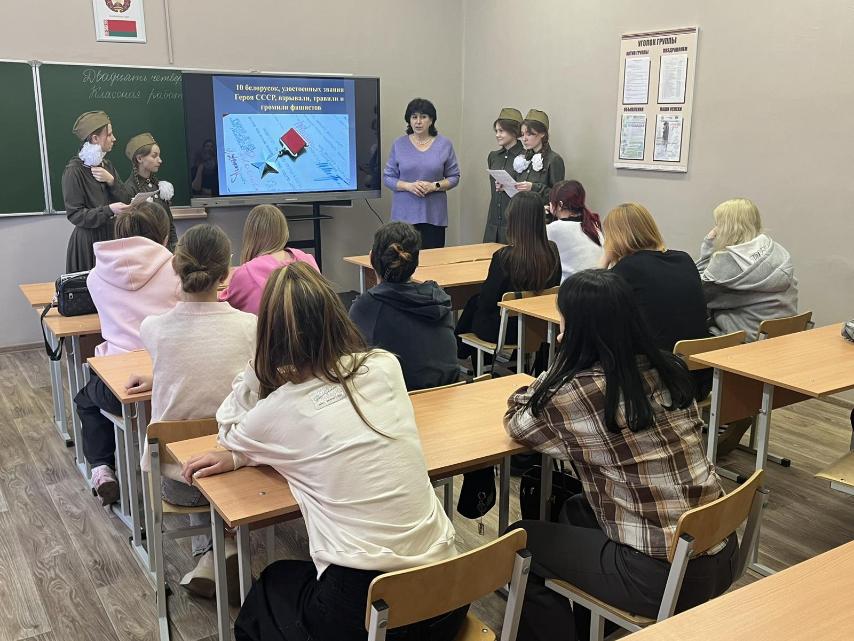 24 октября в группе Б322-23 в рамках проекта: «Слава Героям Великой Победы» прошёл «Урок Мужества». Мероприятие подготовлено и проведено учащимися творческого объединения «Патриот» и посвящено женщинам белорускам, которые имеют звание Героя СССР за совершенный подвиг в годы Великой Отечественной войны.